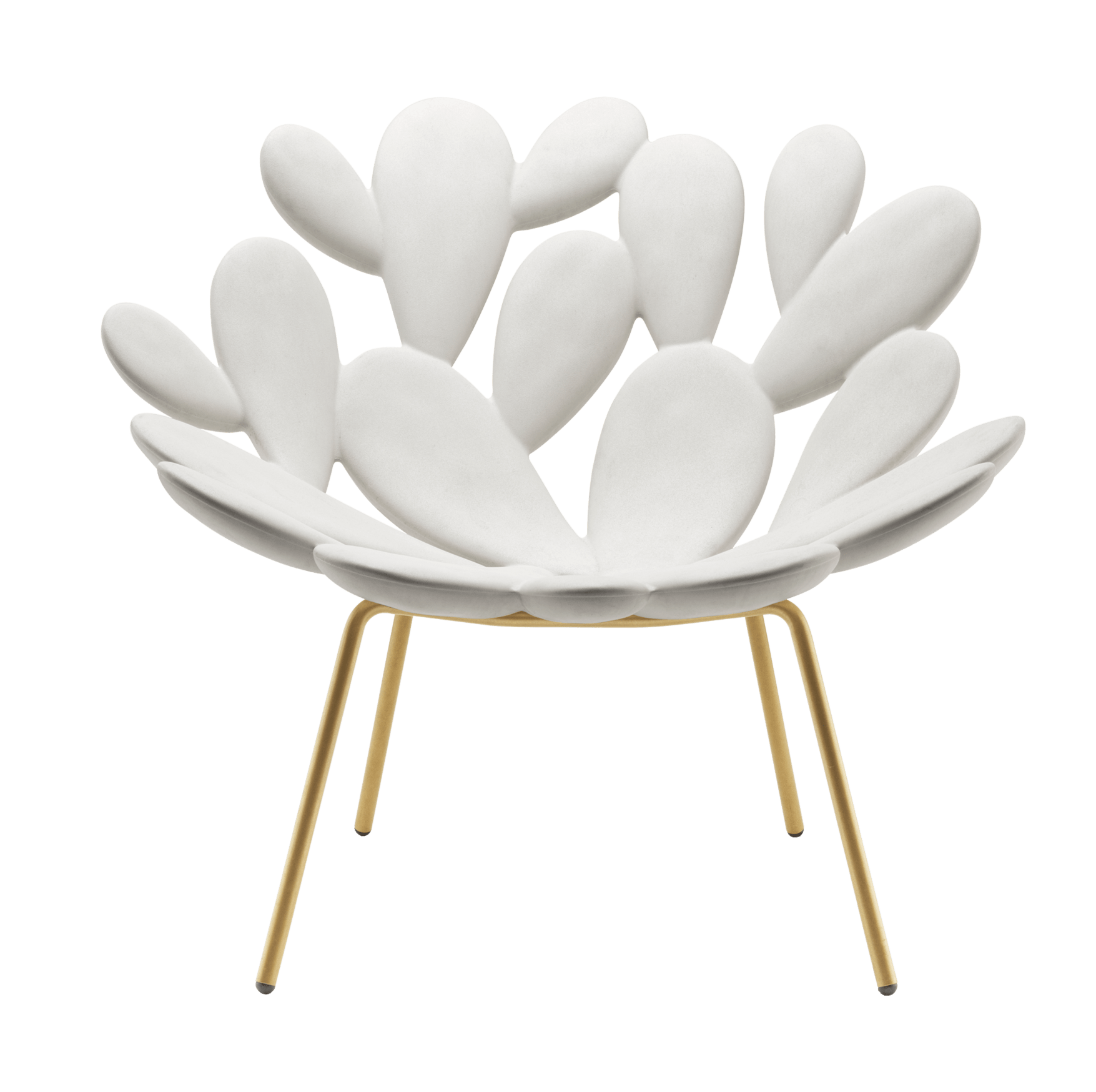 The Filicudi Armchair Brass by Qeeboo, designed by Marcantonio, brings a touch of Mediterranean charm to your living spaces. Inspired by the iconic prickly pear cactus, this armchair evokes memories of vacations and the allure of wild nature. Its distinctive design features a polyethylene seat that mirrors the plant’s unique silhouette, complemented by elegant brass-finished metal legs.  Weighing approximately 44 lbs., the Filicudi Armchair is suitable for both indoor and outdoor use, making it a versatile addition to any setting.