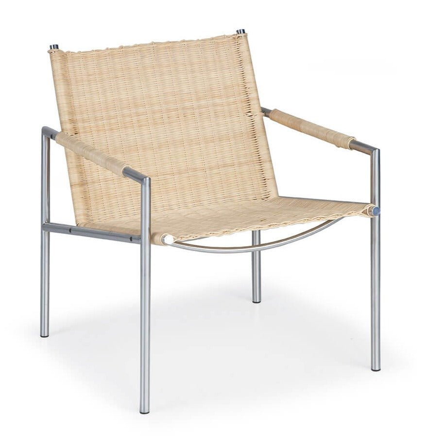 The SZ 01 Armchair was designed in 1960 by Martin Visser. The pure material, the clear construction, and the minimalist design language are typical of Visser’s work. The armchair has a slim tubular steel frame, in matte chrome or powder-coated black, and a woven rattan (pit cane) seat, back, and arms.